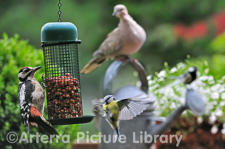 Subject: Eurasian collared dove (Streptopelia decaocto), blue tit (Cyanistes caeruleus / Parus caeruleus), great tit (Parus major) and great spotted woodpecker (Dendrocopos major) juvenile eating peanuts from bird feeder on balcony, Belgium